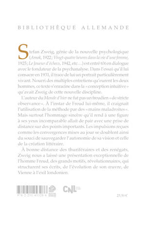 Stefan Zweig, génie de la nouvelle psychologique (Amok, 1922 ; Vingt-quatre heures dans la vie d’une femme, 1925 ; Le Joueur d’échecs, 1942, etc…) est entré tôt en dialogue avec le fondateur de la psychanalyse. Dans l’essai qu’il lui consacre en 1931, il trace de lui un portrait particulièrement vivant. Nourri des multiples entretiens qu’eurent les deux hommes, ce texte s’enracine dans la « conception intuitive » qu’avait Zweig de cette nouvelle discipline.