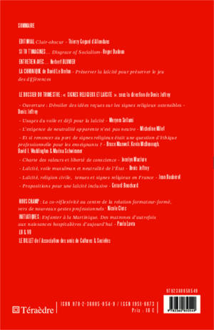 "On ne peut parler de laïcité sans évoquer ce qui, d'une certaine manière, la fonde : le religieux et ses espaces.[...] Le dossier de ce trimestre [...] nous montre que quasiment toutes les sociétés occidentales s'interrogent aujourd'hui sur les modalités d'une laïcité acceptable et acceptée par tous ; mais les questionnements, notamment sur les signes religieux ostensibles, et les réponses politiques qui en découlent, diffèrent d'un espace culturel à l'autre." Thierry Goguel D'Allondans