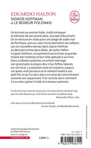 Dans Signor Hoffman, un écrivain se rend en Italie, invité à évoquer la mémoire de son grand-père, rescapé d’Auschwitz. On le retrouve en route pour une plage de sable noir du Pacifique, puis au cœur d’une plantation de caféiers. Chacune des nouvelles de ce recueil se déroule entre deux pôles, de señor Halfon à signor Hoffman. La musique des mots célèbre tout à la fois la grande misère des hommes et leur folle aptitude à survivre.