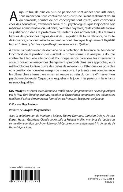 Les éducateurs, les travailleurs sociaux et les psychologues doivent souvent aider, à la demande ou au profit d'un tiers, des personnes qui ne souhaitent pas toujours l'être. Décrivant sa pratique au travers de situations et de fragments d'entretiens, l'auteur met à plat l'inconfort de sa position et analyse la double contrainte à laquelle elle conduit. Il montre comment il est possible d'inciter les personnes concernées à quitter leur attitude d'opposition et à s'impliquer dans la relation.