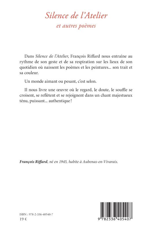 Dans Silence de l'Atelier, François Riffard nous entraîne au rythme de son geste et de sa respiration sur les lieux de son quotidien où naissent les poèmes et les peintures... son trait et sa couleur. Un monde aimant ou pesant, c'est selon. Il nous livre une oeuvre où le regard, le doute, le souffle se croisent, se reflètent et se rejoignent dans un chant majestueux ténu, puissant... authentique !