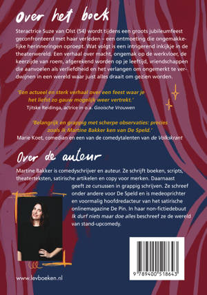 Steractrice Suze van Olst wordt tijdens een groots jubileumfeest geconfronteerd met haar verleden – een ontmoeting die ongemakkelijke herinneringen oproept. Wat volgt is een intrigerend inkijkje in de theaterwereld. Een verhaal over macht, ongemak op de werkvloer, de keerzijde van roem, vriendschappen die aanvoelen als verliefdheid en het verlangen om ongemerkt te verdwijnen in een wereld waar juist alles draait om gezien worden.