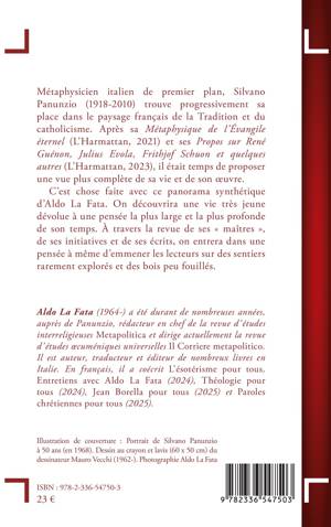 Métaphysicien italien de premier plan, Silvano Panunzio (1918-2010) trouve progressivement sa place dans le paysage français de la Tradition et du catholicisme. Après sa Métaphysique de l’Évangile éternel (L’Harmattan, 2021) et ses Propos sur René Guénon, Julius Evola, Frithjof Schuon et quelques autres (L’Harmattan, 2023), il était temps de proposer une vue plus complète de sa vie et de son œuvre. C’est chose faite avec ce panorama synthétique d’Aldo La Fata. On découvrira une vie très jeune dévolue à une pensée la plus large et la plus profonde de son temps. À travers la revue de ses « maîtres », de ses initiatives et de ses écrits, on entrera dans une pensée à même d’emmener les lecteurs sur des sentiers rarement explorés et des bois peu fouillés.