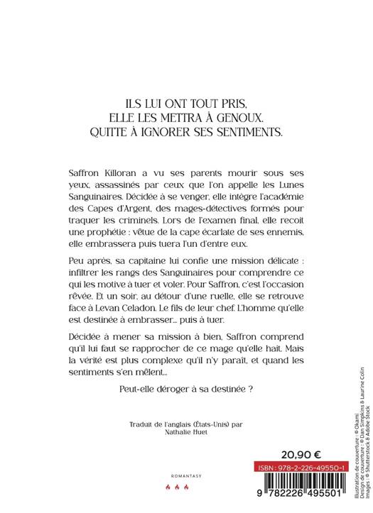 Saffron Killoran a vu ses parents mourir sous ses yeux, assassinés par ceux que l'on appelle les Lunes Sanguinaires. Décidée à se venger, elle intègre l'académie des Capes d'Argent, des mages-détectives formés pour traquer les criminels. Lors de l'examen final, elle reçoit une prophétie : vêtue de la cape écarlate de ses ennemis, elle embrassera puis tuera l'un d'entre eux.