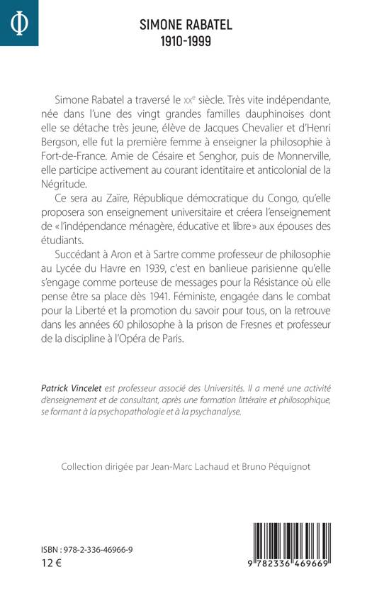 Simone Rabatel a traversé le xxe siècle. Très vite indépendante, née dans l’une des vingt grandes familles dauphinoises dont elle se détache très jeune, élève de Jacques Chevalier et d’Henri Bergson, elle fut la première femme à enseigner la philosophie à Fort-de-France. Amie de Césaire et Senghor, puis de Monnerville, elle participe activement au courant identitaire et anticolonial de la Négritude. Ce sera au Zaïre, République démocratique du Congo, qu’elle proposera son enseignement universitaire et créera l’enseignement de « l’indépendance ménagère, éducative et libre » aux épouses des étudiants. Succédant à Aron et à Sartre comme professeur de philosophie au Lycée du Havre en 1939, c’est en banlieue parisienne qu’elle s’engage comme porteuse de messages pour la Résistance où elle pense être sa place dès 1941. Féministe, engagée dans le combat pour la Liberté et la promotion du savoir pour tous, on la retrouve dans les années 60 philosophe à la prison de Fresnes et professeur de la discipline à l’Opéra de Paris.