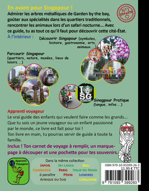En avant pour Singapour !<br /> Admirer les arbres métalliques de Garden by the bay, goûter aux spécialités dans les quartiers traditionnels, rencontrer les animaux lors d’un safari nocturne... Le vrai guide de voyage des enfants qui veulent faire comme les grands ! Son livre en main, il pourra servir de guide à toute la famille et aura tout ce qu’il faut pour découvrir cette région passionnante.<br /> Contenu : Une section pour découvrir la cité-État et ses habitants : géographie, histoire, culture, mode vie, arts, gastronomie, sports, faune et flore... Une section de visite par thèmes : quartiers, nature, musées, lieux de loisirs, aux alentours... Une section pratique : langue, infos pratiques, moyens de transport, conseils.<br /> Les petits plus : une mise en page attractive (colorée, textes courts, nombreuses photos et illustrations), une section pour décrire ses expériences de voyage, une pochette pour conserver ses souvenirs, un marque-page à découper.