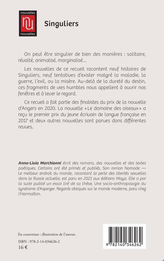 On peut être singulier de bien des manières: solitaire, révolté, animalisé, marginalisé... Les nouvelles de ce recueil racontent neuf histoires de Singuliers, neuf tentatives d'exister malgré la maladie, la guerre, l'exil, ou la misère. Au-delà de la dureté du destin, ces fragments de vies humbles nous appellent à ouvrir nos fenêtres et à lever le regard. Ce recueil a fait partie des finalistes du prix de la nouvelle d'Angers en 2020. La nouvelle Le domaine des oiseaux a reçu le premier prix du jeune écrivain de langue française en 2017 et deux autres nouvelles sont parues dans différentes revues.