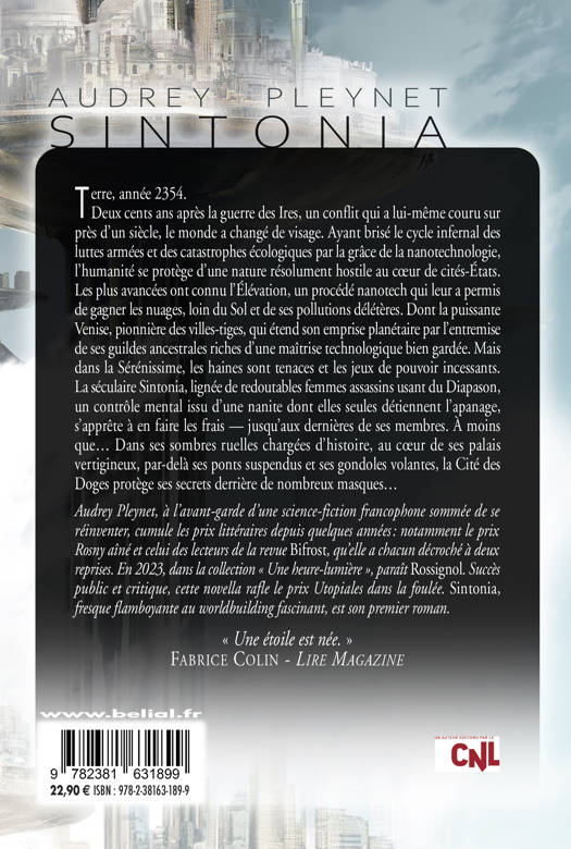 Terre, année 2354.Deux cents ans après la guerre des Ires, un conflit qui a lui-même couru sur près d’un siècle, le monde a changé de visage. Ayant brisé le cycle infernal des luttes armées et des catastrophes écologiques par la grâce de la nanotechnologie, l’humanité se protège d’une nature résolument hostile au cœur de cités-États. Les plus avancées ont connu l’Élévation, un procédé nanotech qui leur a permis de gagner les nuages, loin du Sol et de ses pollutions délétères. Dont la puissante Venise, pionnière des villes-tiges, qui étend son emprise planétaire par l’entremise de ses guildes ancestrales riches d’une maîtrise technologique bien gardée. Mais dans la Sérénissime, les haines sont tenaces et les jeux de pouvoir incessants. La séculaire Sintonia, lignée de redoutables femmes assassins usant du Diapason, un contrôle mental issu d’une nanite dont elles seules détiennent l’apanage, s’apprête à en faire les frais — jusqu’aux dernières de ses membres. À moins que… Dans ses sombres ruelles chargées d’histoire, au cœur de ses palais vertigineux, par-delà ses ponts suspendus et ses gondoles volantes, la Cité des Doges protège ses secrets derrière de nombreux masques…