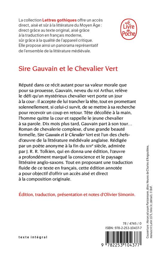 Neveu du roi Arthur, réputé dans ce récit autant pour sa valeur morale que pour sa prouesse, Gauvain relève le défi qu’un mystérieux chevalier vert porte un jour à la cour : il accepte de lui trancher la tête, tout en promettant solennellement, si celui-ci survit, de se mettre à sa recherche pour recevoir un coup en retour. Tête décollée à la main, l’homme quitte la cour et rappelle le jeune chevalier à sa parole. Dix mois plus tard, Gauvain part à son tour… Roman de chevalerie complexe, d’une grande beauté formelle, Sire Gauvain et le Chevalier Vert est l’un des chefs-d’œuvre de la littérature médiévale anglaise. Rédigée par un poète anonyme à la fin du XIVe siècle, admirée par J. R. R. Tolkien, qui en donna une édition, l’œuvre a profondément marqué la conscience et le paysage littéraire outre-Manche. Cette édition a pour objectif d’offrir un accès aisé et direct à la composition originale.