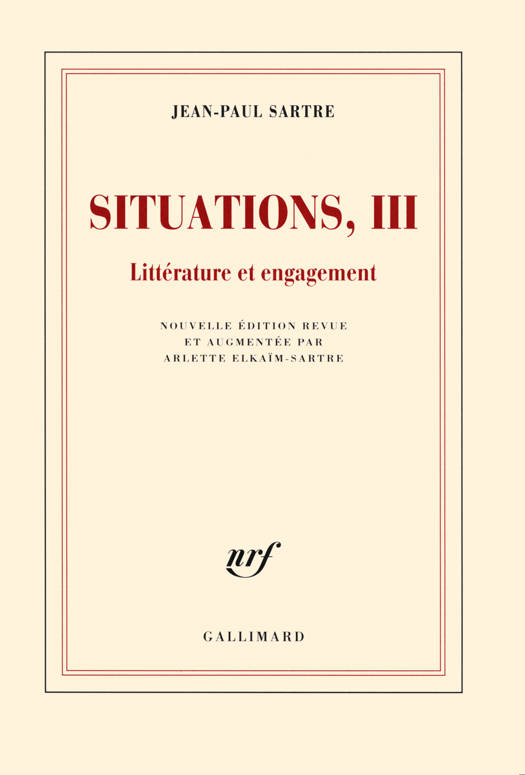 Dans son essai Qu'est-ce que la littérature ? (1947), Sartre analyse les différents rôles que cette activité a tenus dans la société française, du XVIIᵉ siècle à la Seconde Guerre mondiale, et explique les raisons qui l'ont poussé à opter pour la littérature engagée ; il se prépare résolument à "avoir le monde entier sur la tête", selon l'expression de Jean Paulhan, parfois au détriment de son oeuvre propre - articles sur la future naissance d'Israël (1948), sur la guerre d'Indochine (1949), appartenance au Rassemblement démocratique révolutionnaire dans l'espoir de contribuer à conjurer la menace de "guerre atomique" entre l'Union soviétique et les États-Unis. Il continue néanmoins à s'intéresser à d'autres aspects de la littérature, à Franz Kafka, à Nathalie Sarraute, aussi bien qu'aux poètes de la Négritude, à l'art de Giacometti comme à l'avenir de la culture.