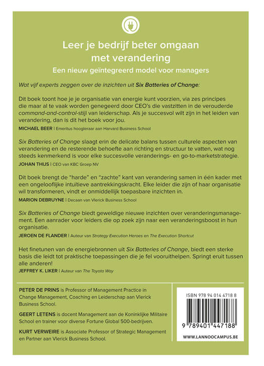 In tijden van disruptie is het cruciaal om verandering juist te managen. Maar de kans op mislukking blijft ontzettend hoog. Six Batteries of Change biedt een verrassend eenvoudig model voor meer effectieve verandering. Gebaseerd op het idee van zes batterijen die volledig opgeladen moeten zijn om de beste resultaten te bekomen, identificeren de auteurs zes punten in organisaties die extra energie verdienen. Het toont je hoe de verschillende 'batterijen' op te laden, maar ook hoe je die energie kan inzetten om transformatiecompetenties te ontwikkelen die je organisatie nog wendbaarder maken. Een grondig onderbouwd model, toegankelijk uitgelegd en rijk geïllustreerd met talrijke cases, zet elke organisatie op weg naar duurzame verandering.