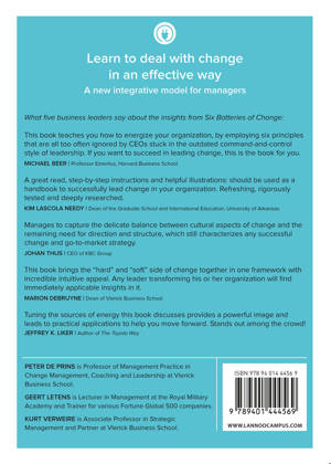 Managing change has become an increasingly critical capability in today's turbulent and disruptive work environment. Nevertheless, research indicates that failure rates of change initiatives remain high. Six Batteries of Change proposes a new model that helps managers to deal with this challenging topic in a more effective way, by assessing the extent to which the batteries that are needed to implement change in your organization are charged. By setting up new frameworks and referring to numerous cases to illustrate the effectiveness of each approach, Six Batteries of Change shows managers how to develop transformation competency by creating a more energized organization, capable of dealing with faster and more complex change.