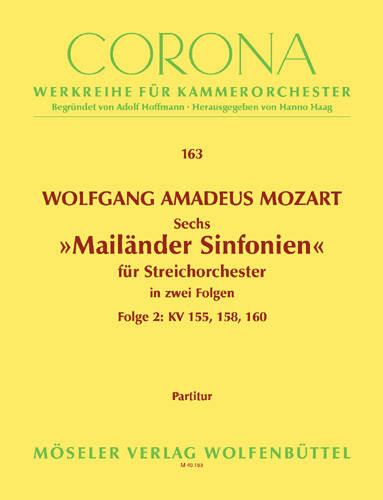 Die "Mailänder Sinfonien", KV 155-160 schrieb Mozart während seiner dritten Italien-Reise, Oktober 1772 bis März 1773, die er zusammen mit seinem Vater unternahm. Im Mittelpunkt der Reise stand die erste Aufführung der Oper "Lucio Silla" in Mailand. Am 28. Oktober schrieb Leopold Mozart in einem Brief aus Bozen "... Der Wolfg. befindet sich auch wohl; er schreibt eben für die lange Weile ein Quatro ..." und am 6. Februar teilt er aus Mailand mit "... der Wolfgang schreibt ein Quartetto ...". Lange Zeit wurden die erwähnten "Quatros" als Streichquartette angesehen. Erst in der Auflage des Köchel-Verzeichnisses von 1965 wurden drei der sechs Stücke als Divertimenti klassifiziert und zwar aufgrund der von Mozart eigenhändig vermerkten Instrumentenverzeichnung "Violini / Viole / Violoncello / Basso" bzw. "Violini / Viole / Basso". Eine Ausgabe als Orchesterquartette ist von daher, auch wegen der musikalischen Faktur der Stücke, gerechtfertigt. Die Werke stehen in der Tradition Samartinis; sie sind eine Weiterentwicklung der "Salzburger Sinfonien", KV 136-138.