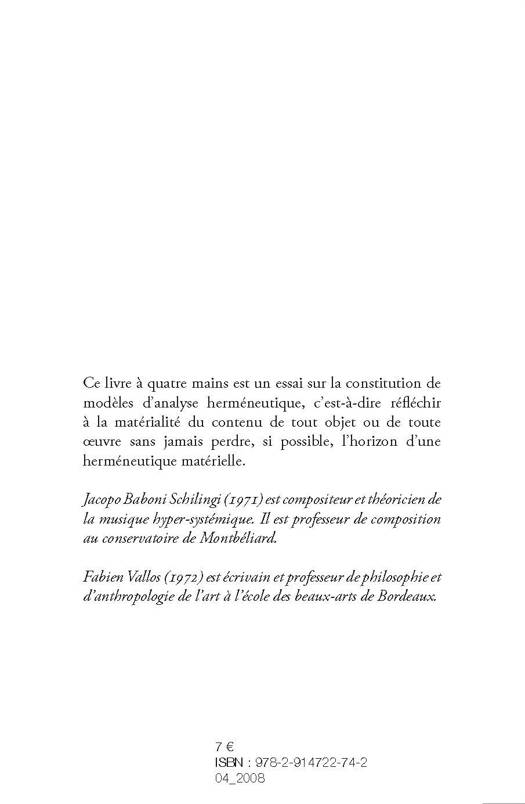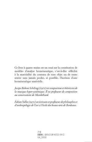 Ce livre à quatre mains est un essai sur la constitution de modèles d'analyse herméneutique, c'est-à-die réfléchir à la matérialité du contenu de tout objet ou de toute œuvre sans jamais perdre, si possible, l'horizon d'une herméneutique matérielle.