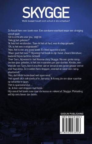 Ze houdt hem een boek voor. Een sombere voorkant waar een dreiging vanuit gaat. 'Dit is echt iets voor jou,' zegt ze. 'Heb jij het gelezen?' 'Ik heb het verslonden. Toen ik het uit had, was ik diep geraakt.' 'Oh, is het een meisjesboek?' 'Nee, het is een erg goed boek. En heel spannend juist.' 'Waar gaat het over?' Hij weegt het boek in zijn hand. Zware literatuur, bedenkt hij en lacht in zichzelf. 'Over Sam, hij woont in het Noorse dorp Skygge. Na een grote ramp dertien jaar geleden, is het zes maanden per jaar donker. Kirstin, een vriendin van Sam, komt erachter dat er iemand een groot gevaar vormt voor hun dorp. Ze moeten hem stoppen, voordat er weer een ramp plaatsvindt.' 'Hm, dat klinkt inderdaad wel spannend.' 'Het speelt zich ook deels af in Jamaica. Ik kreeg zin om daar naartoe op vakantie te gaan.' 'Het is spannend dus ...' 'Ja, ik kon niet stoppen met lezen.' Hij neemt het boek mee naar de kassa en rekent af. Skygge. Plotseling wil hij niets liever dan lezen.