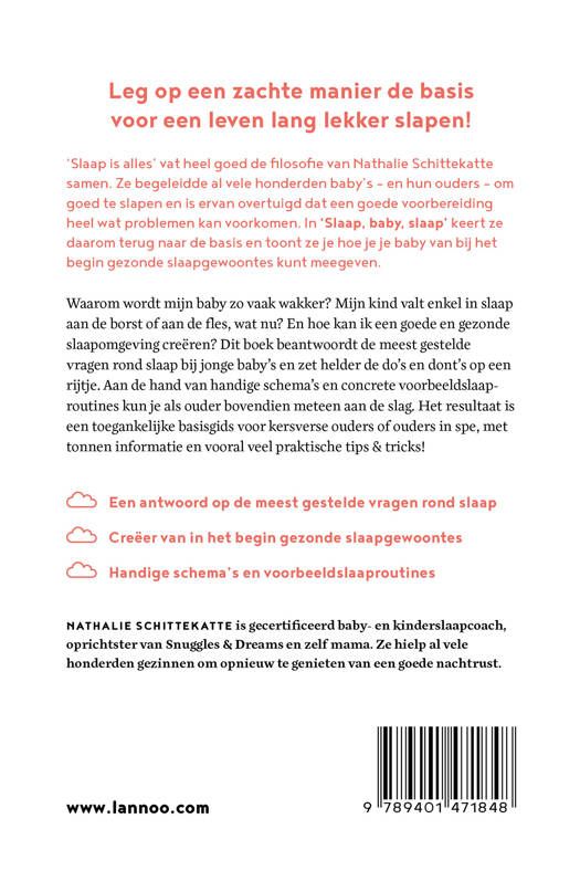 'Slaap is alles' vat heel goed de filosofie van Nathalie Schittekatte samen. Ze begeleidde al vele honderden baby's - en hun ouders - om goed te slapen en is ervan overtuigd dat een goede voorbereiding heel wat problemen kan voorkomen. In Slaap, baby, slaap keert ze daarom terug naar de basis en toont ze je hoe je je baby van bij het begin gezonde slaapgewoontes kunt meegeven. Waarom wordt mijn baby zo vaak wakker? Mijn kind valt enkel in slaap aan de borst of aan de fles, wat nu? En hoe kan ik een goede en gezonde slaapomgeving creëren? Dit boek beantwoordt de meest gestelde vragen rond slaap bij jonge baby's en zet helder de do's en dont's op een rijtje. Aan de hand van handige schema's en concrete voorbeeldslaaproutines kun je als ouder bovendien meteen aan de slag. Het resultaat is een toegankelijke basisgids voor kersverse ouders of ouders in spe, met tonnen informatie en vooral veel praktische tips & tricks!