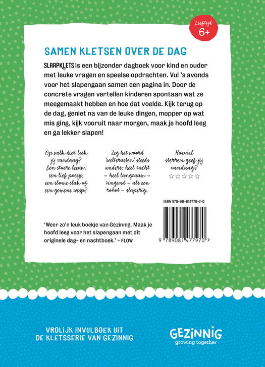 Tekst achterflap Slaapklets! is een dag- en nachtboek voor kleine en grote mensen. Een boek met vragen en opdrachtjes. Vul voor het slapengaan een pagina in. Schrijf, kies, kruis aan, teken, ontspan, lach, lees. En klets!