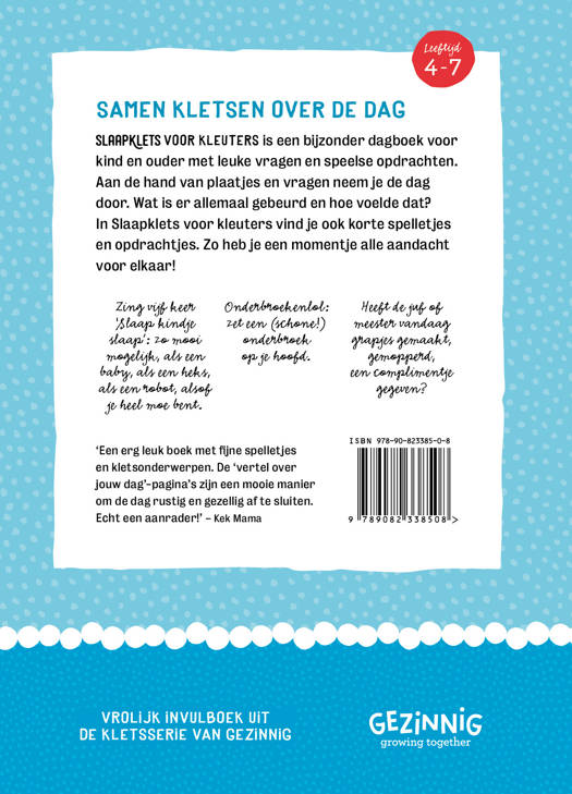 Slaapklets! voor kleuters is een dagboek voor het slapengaan. Met behulp van plaatjes en vragen kun je de dag doornemen met je kind. Wat is er allemaal gebeurd en hoe voelde dat? Slaapklets! voor kleuters is: - kletsen over de dag - nog even gek doen - je kind lekker instoppen - 10 minuutjes quality time