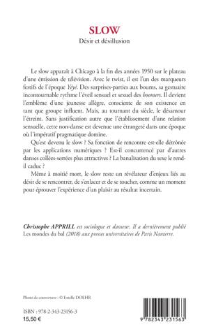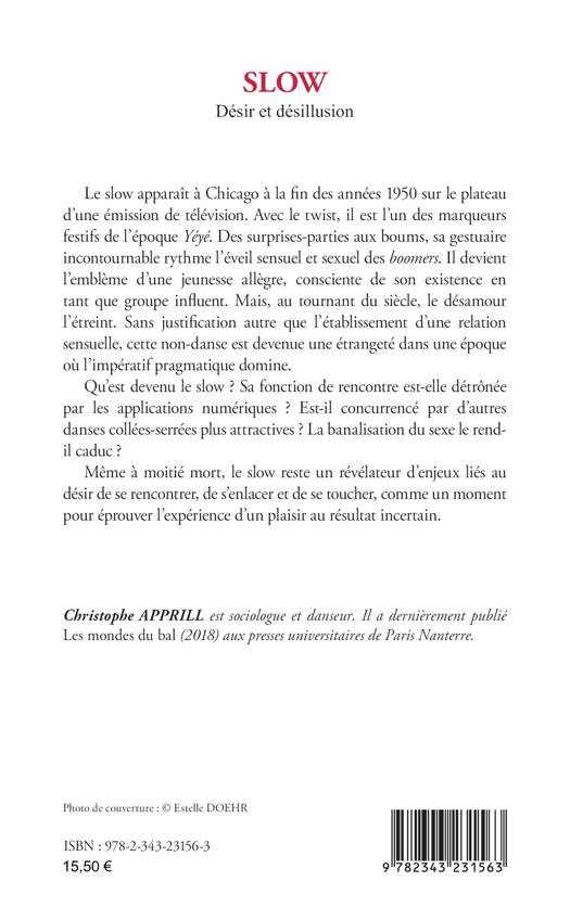 Le slow apparaît à Chicago à la fin des années 1950 sur le plateau d'une émission de télévision. Avec le twist, il est l'un des marqueurs festifs de l'époque Yéyé. Des surprises-parties aux boums, sa gestuaire incontournable rythme l'éveil sensuel et sexuel des boomers. Il devient l'emblème d'une jeunesse allègre, consciente de son existence en tant que groupe influent. Mais, au tournant du siècle, le désamour l'étreint. Sans justification autre que l'établissement d'une relation sensuelle, cette non-danse est devenue une étrangeté dans une époque où l'impératif pragmatique domine. Qu'est devenu le slow ? Sa fonction de rencontre est-elle détrônée par les applications numériques ? Est-il concurrencé par d'autres danses collées-serrées plus attractives ? La banalisation du sexe le rend-il caduc ? Même à moitié mort, le slow reste un révélateur d'enjeux liés au désir de se rencontrer, de s'enlacer et de se toucher, comme un moment pour éprouver l'expérience d'un plaisir au résultat incertain.