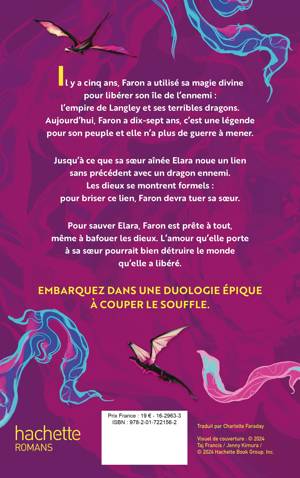 Faron Vincent est capable d'invoquer le pouvoir des dieux. Cinq ans plus tôt, sa magie divine lui a permis de libérer son île de l'ennemi – l'empire de Langley et ses impitoyables dragons. À dix-sept ans, Faron est une légende pour son peuple et une nuisance pour les royaumes voisins. Toute puissante, la jeune femme pensait n’avoir plus aucune guerre à mener. Jusqu’à ce qu’elle découvre, lors d’un sommet international pour la paix, que sa sœur aînée, Elara, noue un lien sans précédent avec un dragon ennemi. Les dieux se montrent formels : pour briser ce lien, Faron devra tuer Elara…