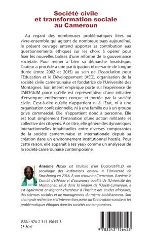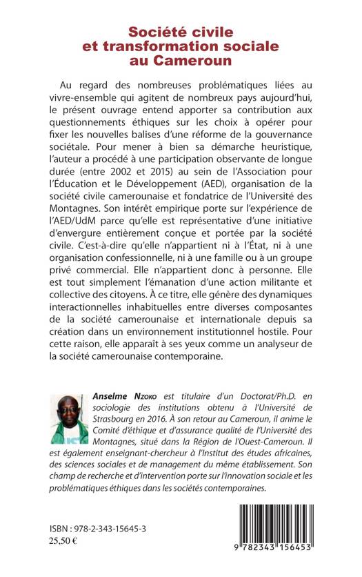 Au regard des problématiques liées au vivre-ensemble, cet ouvrage s'interroge sur les choix à opérer pour fixer les nouvelles balises d'une réforme de la gouvernance sociétale. L'auteur a procédé à une participation observante de longue durée (entre 2002 et 2015) au sein de l'Association pour l'Éducation et le Développement (AED), organisation de la société civile camerounaise.Elle génère des dynamiques interactionnelles inhabituelles entre diverses composantes de la société camerounaise et internationale depuis sa création dans un environnement institutionnel hostile. Elle apparaît donc comme un analyseur de la société camerounaise contemporaine.