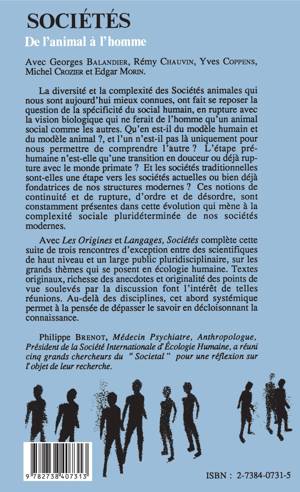 La diversité et la complexité des sociétés animales ont amené à se poser la question de la spécificité du modèle social humain, en rupture avec la vision biologique qui ne ferait de l'homme qu'un animal social comme les autres. Continuité et rupture, ordre et désordre son constamment présentes dans cette évolution qui mène à la complexité sociale pluridéterminée de nos sociétés modernes.