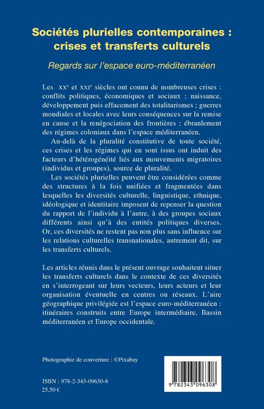 Les sociétés plurielles peuvent être considérées comme des structures à la fois unifiées et fragmentées dans lesquelles les diversités culturelle et identitaire imposent de repenser la question du rapport de l'individu à l'autre, à des groupes sociaux différents ainsi qu'à des entités politiques diverses. Or, ces diversités ne sont pas sans influence sur les transferts culturels. L'aire géographique ici privilégiée est l'espace euro-méditerranéen.