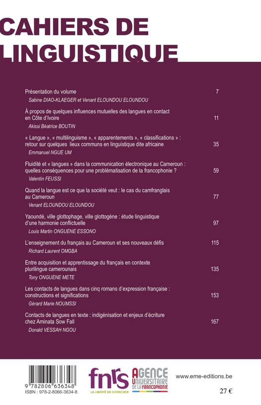 Les Cahiers de Linguistique, qui poursuivent le travail éditorial entrepris depuis 1972 par les Cahiers de l'Institut de Linguistique de Louvain, sont désormais plus spécifiquement consacrés à l'étude des rapports entre une langue dans sa variation - le français - et la société ou, plutôt, les sociétés où elle est employée, dans des contextes toujours plurilingues.