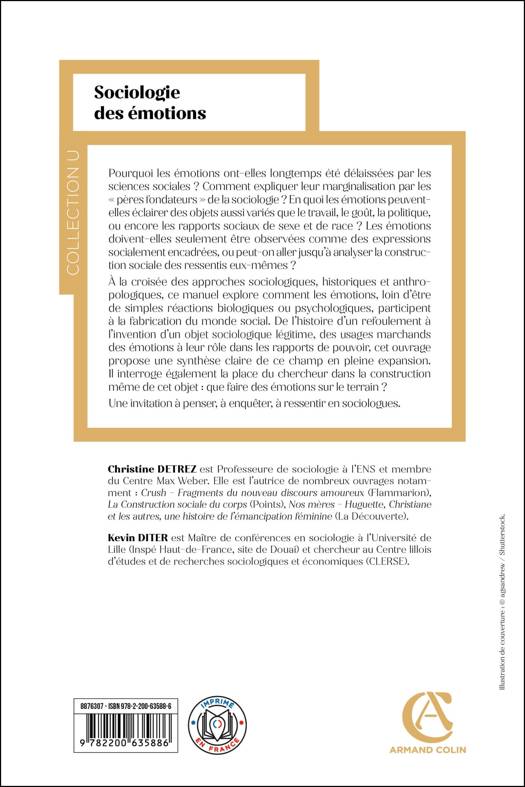 Les dix dernières années se sont caractérisées en France par un essor de publications, en sciences sociales, sur et autour des émotions, au point qu’on a pu évoquer l’existence d’un « emotional turn ». Ce manuel rend compte de ce récent champ de recherche qu’est la sociologie des émotions, avec ses fondements théoriques, des exemples empiriques et les enjeux épistémologiques de sa constitution. Il s’agit de s’interroger, dans un premier temps, sur les raisons historiques du rejet ou de la dévalorisation des émotions chez les « pères fondateurs » de la scoiologie. Seront explorés ensuite les apports de la sociologie des émotions, en posant la question de ce que peut la sociologie en matière d’émotions : doit-elle se limiter à l’analyse des variations sociales de la gestion et des expressions émotionnelles ? Ou son ambition peut-elle aller jusqu’à explorer les variations sociales des ressentis eux-mêmes, voire à expliciter leur origine et leur développement, souvent relégués dans le champ de la biologie ou de la psychologie ? En quoi la prise en compte des émotions vient-elle enrichir des thématiques classiques comme la sociologie politique, la sociologie de la culture, de l’enfance, du travail ou du goût ? Enfin, la réflexion portera sur la place du chercheur dans cette prise en compte des émotions : les émotions ne sont-elles qu’un objet, sociologiquement construit, ou viennent-elles interroger la place, extérieure, surplombante, du chercheur, exigeant de lui d’être, également, « affecté » ?