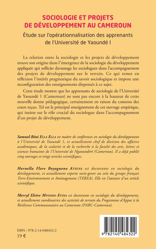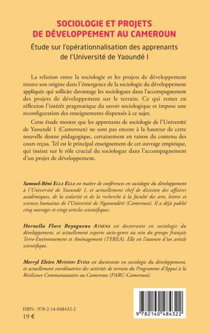 La relation entre la sociologie et les projets de développement trouve son origine dans l'émergence de la sociologie du développement appliquée qui sollicite davantage les sociologues dans l'accompagnement des projets de développement sur le terrain. Ce qui remet en réflexion l'intérêt pragmatique du savoir sociologique et impose une reconfiguration des enseignements dispensés à ce sujet. Cette étude montre que les apprenants de sociologie de l'Université de Yaoundé 1 (Cameroun) ne sont pas encore à la hauteur de cette nouvelle donne pédagogique, certainement en raison du contenu des cours reçus. Tel est le principal enseignement de cet ouvrage empirique, qui insiste sur le rôle crucial du sociologue dans l'accompagnement d'un projet de développement.