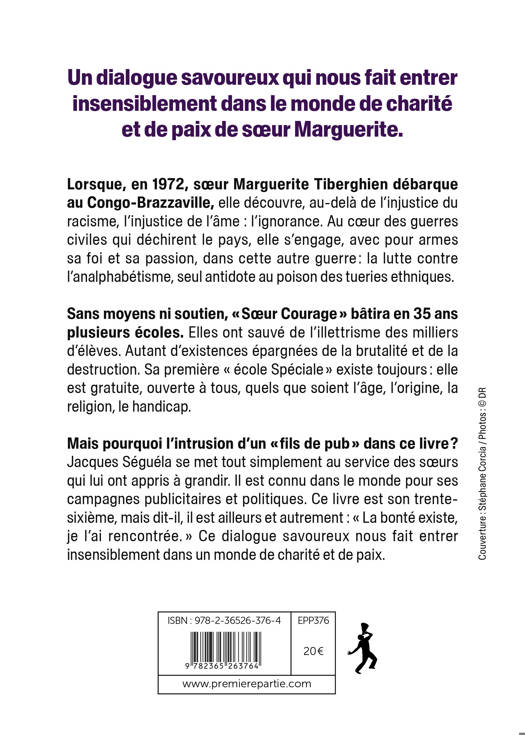 Lorsque, en 1972, sÅur Marguerite Tiberghien débarque au Congo-Brazzaville, elle découvre, au-delà de linjustice du racisme, linjustice de lâmelignorance. Au cÅur des guerres civiles qui déchirent les pays, elle sengage, avec pour armes sa foi et sa passion, dans cette autre guerre : la lutte contre lanalphabétisme, seul antidote au poison des tueries ethniques. Sans moyens dabord, «Åur Courage» bâtira plusieurs écoles où sont passés, à ce jour, des dizaines de milliers délèves. Autant dexistences sauvées de la brutalité et de la destruction. Son «École spéciale» est gratuite, ouverte à tous quels que soient lâge, la race, la religion, le handicap, et destinée aux exclus du système scolaire. Mais pourquoi lintrusion dun «de pub» dans ce livre ? Jacques Séguéla se met tout simplement au service des sÅurs qui lui ont appris à grandir. Et il se laisse, comme le lecteur, piéger par cette «de Dieu» lors dun dialogue savoureux qui nous fait entrer insensiblement dans son monde de charité et de paix. «bonté existe, je lai rencontrée», conclut-il.