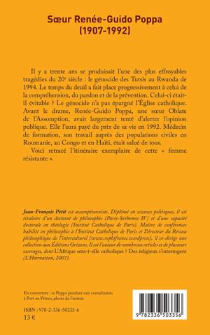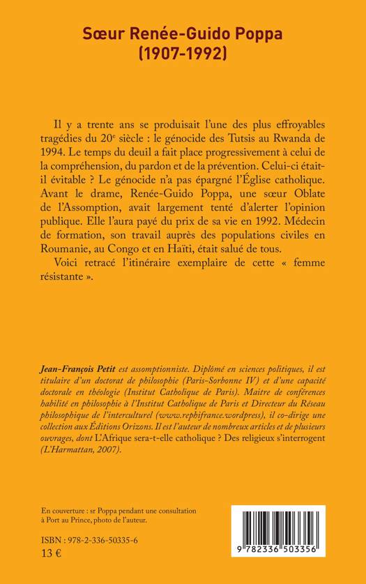 Il y a trente ans se produisait l'une des plus effroyables tragédies du 20e siècle: le génocide des Tutsis au Rwanda de 1994. Le temps du deuil a fait place progressivement à celui de la compréhension, du pardon et de la prévention. Celui-ci était-il évitable ? Le génocide n'a pas épargné l'Église catholique. Avant le drame, Renée-Guido Poppa, une soeur Oblate de l'Assomption, avait largement tenté d'alerter l'opinion publique. Elle l'aura payé du prix de sa vie en 1992. Médecin de formation, son travail auprès des populations civiles en Roumanie, au Congo et en Haïti, était salué de tous. Voici retracé l'itinéraire exemplaire de cette femme résistante .
