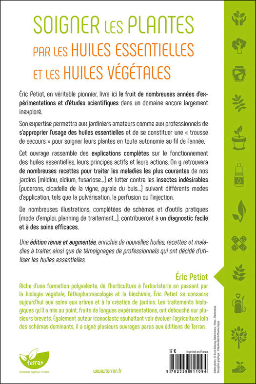 Éric Petiot, en véritable pionnier, livre ici le fruit de nombreuses années d’expérimentations et d’études scientifiques dans un domaine encore largement inexploré. Son expertise permettra aux jardiniers amateurs comme aux professionnels de s’approprier l’usage des huiles essentielles et de se constituer une « trousse de secours » pour soigner leurs plantes en toute autonomie au fil de l’année. Cet ouvrage rassemble des explications complètes sur le fonctionnement des huiles essentielles, leurs principes actifs et leurs actions. On y retrouvera de nombreuses recettes pour traiter les maladies les plus courantes de nos jardins (mildiou, oïdium, fusariose…) et lutter contre les insectes indésirables (pucerons, cicadelle de la vigne, pyrale du buis…) suivant différents modes d’application, tels que la pulvérisation, la perfusion ou l’injection. De nombreuses illustrations, complétées de schémas et d’outils pratiques (mode d’emploi, planning de traitement…), contribueront à un diagnostic facile et à des soins efficaces. Une édition revue et augmentée, enrichie de nouvelles huiles, recettes et maladies à traiter, ainsi que de témoignages de professionnels qui ont décidé d’utiliser les huiles essentielles.