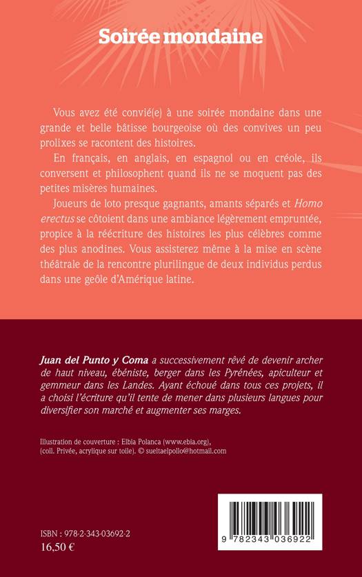 Vous avez été convié(e) à une soirée mondaine dans une grande et belle bâtisse bourgeoise où des convives un peu prolixes se racontent des histoires. En français, en anglais, en espagnol ou en créole, ils conversent et philosophent quand ils ne se moquent pas des petites misères humaines. Joueurs de loto presque gagnants, amants séparés et Homo erectus se côtoient dans une ambiance légèrement empruntée, propice à la réécriture des histoires les plus célèbres comme