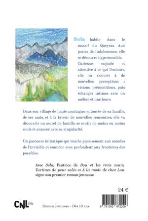 Sola habite dans le massif du Queyras. Aux portes de l’adolescence, elle se découvre hypersensible. Curieuse, enjouée et attentive à ce qui l’entoure, elle va s’ouvrir à de nouvelles perceptions : visions, prémonitions, puis échanges intimes avec un mélèze et une louve.