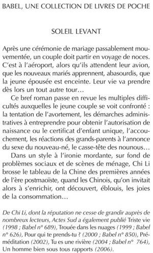 De Chi Li, dont la réputation ne cesse de grandir auprès de nombreux lecteurs, Actes Sud a également publié Triste vie (1998 ; Babel n° 689), Trouée dans les nuages (1999 ; Babel n° 626), Pour qui te prends-tu ? (2000 ; Babel n° 850), Préméditation (2002), Tu es une rivière (2004 ; Babel n° 764), Un homme bien sous tous rapports (2006).
