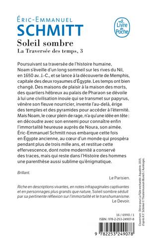 Poursuivant sa traversée de l’histoire humaine, Noam s’éveille d’un long sommeil sur les rives du Nil, en 1650 av. J.-C., et se lance à la découverte de Memphis, capitale des deux royaumes d’Égypte. Les temps ont bien changé. Des maisons de plaisir à la Maison des morts, des quartiers hébreux au palais de Pharaon se dévoile à lui une civilisation inouïe qui se transmet sur papyrus, vénère son fleuve nourricier, invente l’au-delà, érige des temples et des pyramides pour accéder à l’éternité. Mais Noam, le cœur plein de rage, n’a qu’une idée en tête : en découdre avec son ennemi pour connaître enfin l’immortalité heureuse auprès de Noura, son aimée. Éric-Emmanuel Schmitt nous embarque cette fois en Égypte ancienne, au cœur d’un monde qui prospéra pendant plus de trois mille ans, et restitue cette effervescence, dont notre modernité a conservé des traces, mais qui reste dans l’Histoire des hommes une parenthèse aussi sublime qu’énigmatique.