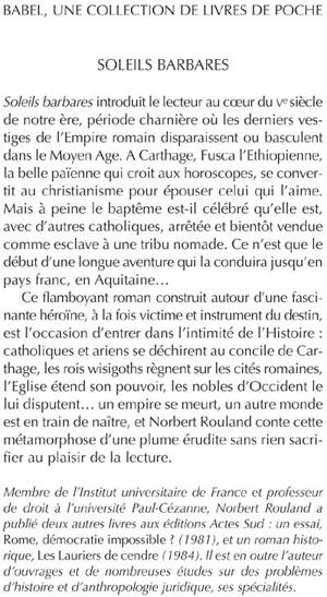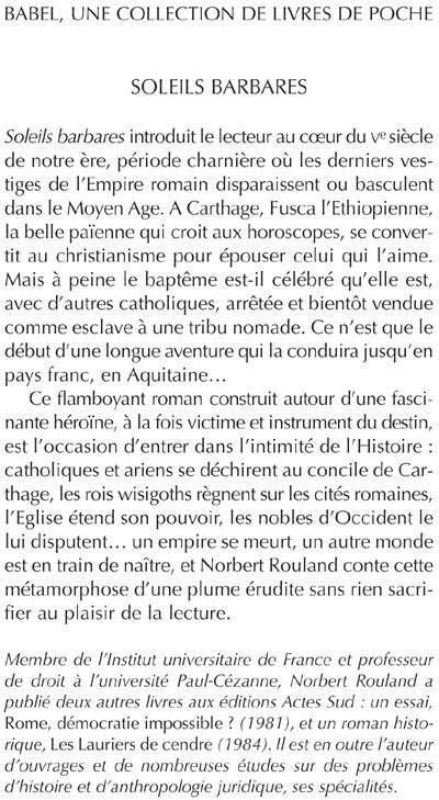 Soleils barbares introduit le lecteur au coeur du vesiècle de notre ère, période charnière où les derniers vestiges de l'Empire romain disparaissent ou basculent dans le Moyen Age. A Carthage, Fusca l'Ethiopienne, la belle païenne qui croit aux horoscopes, se convertit au christianisme pour épouser celui qui l'aime. Mais à peine le baptême est-il célébré qu'elle est, avec d'autres catholiques, arrêtée et bientôt vendue comme esclave à une tribu nomade. Ce n'est que le début d'une longue aventure qui la conduira jusqu'en pays franc, en Aquitaine... Ce flamboyant roman construit autour d'une fascinante héroïne, à la fois victime et instrument du destin, est l'occasion d'entrer dans l'intimité de l'Histoire : catholiques et ariens se déchirent au concile de Carthage, les rois wisigoths régnent sur les cités romaines, l'Eglise étend son pouvoir, les nobles d'Occident le lui disputent... un empire se meurt, un autre monde est en train de naître, et Norbert Rouland conte cette métamorphose d'une plume érudite sans rien sacrifier au plaisir de la lecture.