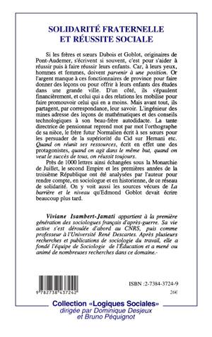 Si les frères et sœurs Dubois et Goblot, originaires de Pont-Audemer, s'écrivent si souvent, c'est pour s'aider à réussir puis à faire réussir leurs enfants. Car, à leurs yeux, hommes et femmes, doivent parvenir à une position. Or l'argent manque à ces fonctionnaires de province pour faire donner des leçons ou pour offrir à leurs enfants des études dans une grande ville. D'un côté, ils s'épaulent financièrement, et celui qui a des relations les mobilise pour faire promouvoir celui qui en a moins. Mais avant tout, ils partagent, par correspondance, leur savoir. L'ingénieur des mines adresse des leçons de mathématiques et des conseils technologiques à son beau-frère autodidacte. La tante directrice de pensionnat reprend mot par mot l'orthographe de sa nièce, le frère futur Normalien écrit à ses sœurs pour les persuader de la supériorité du Cid sur Hernani etc. Quand on réunit ses ressources, écrit en effet une des protagonistes, quand on agit dans le même but, quand on veut le succès de tous, on réussit toujours.