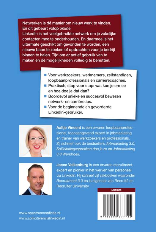 Aaltje Vincent is een ervaren loopbaanprofessional, toonaangevend expert in jobmarketing en trainer van werkzoekers en professionals. Zij schreef ook Jobmarketing 2.0 en Werk vinden met social media. Jacco Valkenburg is een ervaren recruitment expert en pionier in het werven van personeel via LinkedIn. Hij schreef eerder Recruitment via LinkedIn en werd verkozen tot Best Social Recruiter 2009.