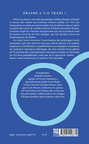 ERASME A-T-IL TRAHI ?Ulrich von Hutten, chevalier germanique, brillant disciple d'Erasme et auteur des Lettres des hommes obscurs, publie en 1523 une Sommation accusant son ancien maitre d'avoir trahi ses amis et Luther en particulier, pour de sordides raisons d'interet personnel. Erasme, lui-meme suspecte d'heresie mais ignorant que son accusateur vient de mourir vers la fin de l'ete, replique par une Eponge a laver les eclaboussures de Hutten.Ces deux textes montrent l'exacerbation des polemiques entre humanistes qui vont dans les mois qui suivent aboutir a la rupture religieuse et a la Reforme, et parallelement, accompagner la naissance du sentiment national en Allemagne. Ils sont enrichis d'une galerie de 95 portraits des contemporains convoques a charge et a decharge par les deux pamphletaires, ainsi que de la vigoureuse riposte lancee contre Erasme par le medecin Otto Brunfels.