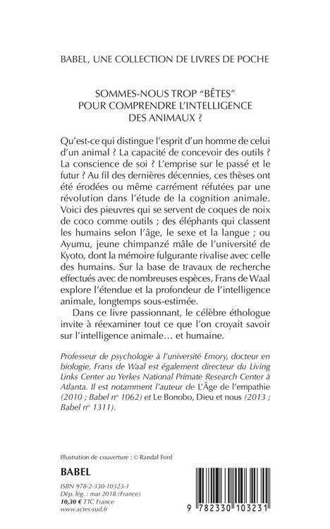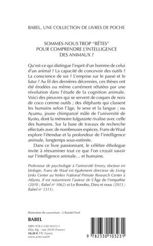 Qu'est-ce qui distingue l'esprit d'un homme de celui d'un animal ? La capacité de concevoir des outils ? La conscience de soi ? L'emprise sur le passé et le futur ? Au fi l des dernières décennies, ces thèses ont été érodées ou même carrément réfutées par une révolution dans l'étude de la cognition animale. Voici des pieuvres qui se servent de coques de noix de coco comme outils ; des éléphants qui classent les humains selon l'âge, le sexe et la langue ; ou Ayumu, jeune chimpanzé mâle de l'université de Kyoto, dont la mémoire fulgurante rivalise avec celle des humains. Sur la base de travaux de recherche effectués avec de nombreuses espèces, Frans de Waal explore l'étendue et la profondeur de l'intelligence animale, longtemps sous-estimée.