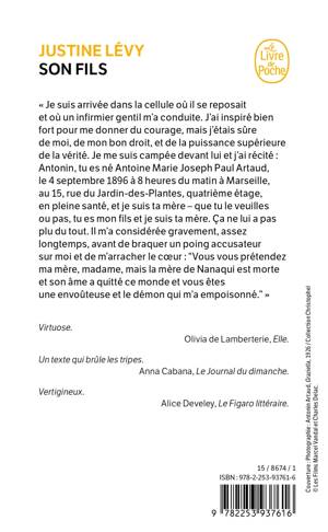 « Je suis arrivée dans la cellule où il se reposait et où un infirmier gentil m’a conduite. J’ai inspiré bien fort pour me donner du courage, mais j’étais sûre de moi, de mon bon droit, et de la puissance supérieure de la vérité. Je me suis campée devant lui et j’ai récité : Antonin, tu es né Antonin Marie Joseph Paul Artaud, le 4 septembre 1896 à 8 heures du matin au 15, rue du Jardin-des-Plantes, quatrième étage, en pleine santé, et je suis ta mère – que tu le veuilles ou pas, tu es mon fils et je suis ta mère. Ça ne lui a pas plu du tout. Il m’a considérée gravement, assez longtemps, avant de braquer un poing accusateur sur moi et de m’arracher le cœur : “Vous vous prétendez ma mère, madame, mais la mère de Nanaqui est morte et son âme a quitté ce monde et vous êtes une envoûteuse et le démon qui m’a empoisonné.” »