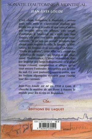 C'est chose fréquente à Montréal : arriver pour trois mois et s'apercevoir soudain que trente ans se sont écoulés et que vous n'auriez pas imaginé votre vie ailleurs. Une sonate d'automne à Montréal ne s'écrit pas sans risques, elle peut être suivie de plusieurs mouvements. "Je ne suis pas pressé" leitmotiv lancinant pour respirer la ville, la langue, la littérature, les femmes et se souvenir d'Octobre... "Drôle de patente", cette ville, on y croise des "pelleteux de nuages" qui rêvent et qui charruent l'indifférence. L'hiver redoutable finit par imposer son largo indispensable et le printemps s'ensuit, composition si allègre qu'on veut encore l'entendre interprétée par le vent du sud. Ce vent jouisseur, sawa-ni-yottin, que les Indiens algonquins tiennent pour l'initiateur des caresses.