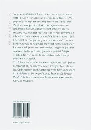 Song- en liedteksten schrijven is een enthousiasmerend betoog over het maken van allerhande liedteksten. Van popsongs en raps tot smartlappen en theaterliederen. Zonder vooropgezette ideeën over rijm en metrum onderzoekt Yke Schotanus wat het betekent als een tekst op muziek gezet moet worden - voor de vorm, de inhoud en het creatieve proces. Wat is het nut van rijm? Hoe komt het dat popsongs en raps vaak heel ritmisch klinken, terwijl ze helemaal geen vast metrum hebben? En hoe maak je van een eenvoudige, toegankelijke tekst zoals een liedje toch iets bijzonders: poëzie? Talrijke voorbeelden van bekende liedteksten maken songs schrijven inzichtelijk.Yke Schotanus is onder andere schrijfdocent, schrijver en componist. Hij publiceerde zowel leesgedichten als liedjes. Gedichten en poëzievertalingen van hem verschenen in de Volkskrant, De zingende zaag, Tzum en De Tweede Ronde. Schotanus is een van de vaste medewerkers van Schrijven Magazine.