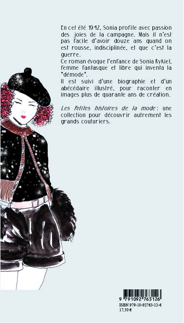 En cet été 1942, Sonia profite avec passion des joies de la campagne. Mais il n’est pas facile d’avoir douze ans quand on est rousse, indisciplinée, et que c’est la guerre… Ce roman évoque l’enfance de Sonia Rykiel, femme fantasque et libre qui inventa la « démode ». Il est suivi d’une biographie et d’un abécédaire illustré, pour raconter en images plus de quarante ans de création. Les Petites histoires de la mode : une collection pour découvrir autrement les grands couturiers.