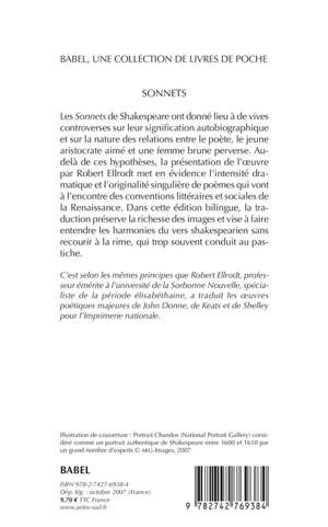 Les Sonnets de Shakespeare ont donné lieu à de vives controverses sur leur signification autobiographique et sur la nature des relations entre le poète, le jeune aristocrate aimé et une femme brune perverse. Au-delà de ces hypothèses, la présentation de l'oeuvre par Robert Ellrodt met en évidence l'intensité dramatique et l'originalité singulière de poèmes qui vont à l'encontre des conventions littéraires et sociales de la Renaissance. Dans cette édition bilingue, la traduction préserve la richesse des images et vise à faire entendre les harmonies du vers shakespearien sans recourir à la rime, qui trop souvent conduit au pastiche.