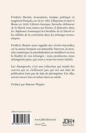 Frédéric Bastiat, économiste, homme politique et magistrat français, est né en 1801 à Bayonne et mort à Rome en 1850. Libéral classique, farouche défenseur de la liberté sous toutes ses formes, il démontre dans les Sophismes économiques les bienfaits de la liberté et les méfaits de la contrainte dans les échanges économiques. Frédéric Bastiat nous rappelle des vérités éternelles, car la nature humaine est immuable. Internet, la monnaie numérique, la mondialisation ne modifient en rien la finalité de nos échanges: nous produisons, nous échangeons parce que nous y trouvons notre intérêt. Les Atemporels, c'est une collection qui réunit des oeuvres qui ne vieillissent pas, qui ont une date de publication mais pas de date de péremption. Car elles seront encore lues et relues dans un siècle. Préfacé par Simone Wapler