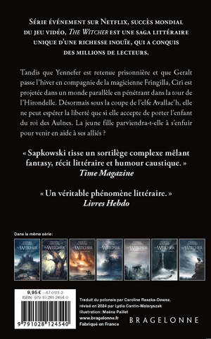 Tandis que Yennefer est retenue prisonnière et que Geralt passe l'hiver en compagnie de la magicienne Fringilla aux charmants artifices, Ciri est projetée dans un monde parallèle en pénétrant dans la tour de l'Hirondelle. Désormais sous la coupe de l'elfe Avallac'h, elle ne peut espérer la liberté que si elle accepte de porter l'enfant du roi des Aulnes. La jeune fille parviendra-t-elle à s'enfuir pour venir en aide à ses alliés ?