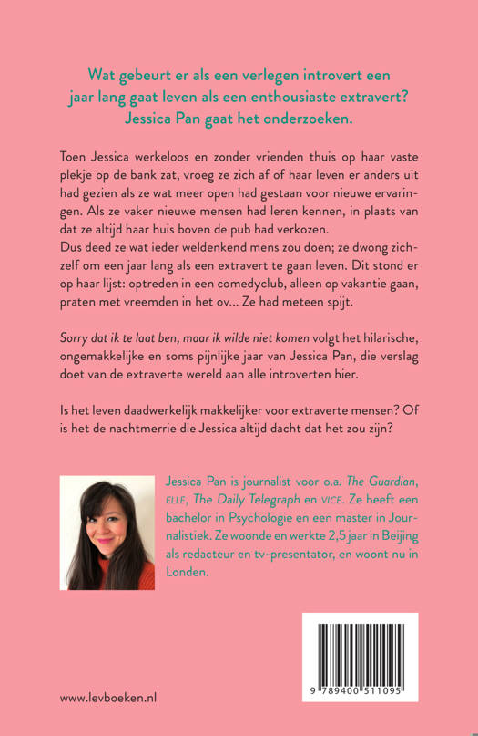 Sorry dat ik te laat ben, maar ik wilde niet komen volgt het hilarische, ongemakkelijke en soms pijnlijke jaar van Jessica Pan, die verslag doet van de extraverte wereld aan alle introverten hier.